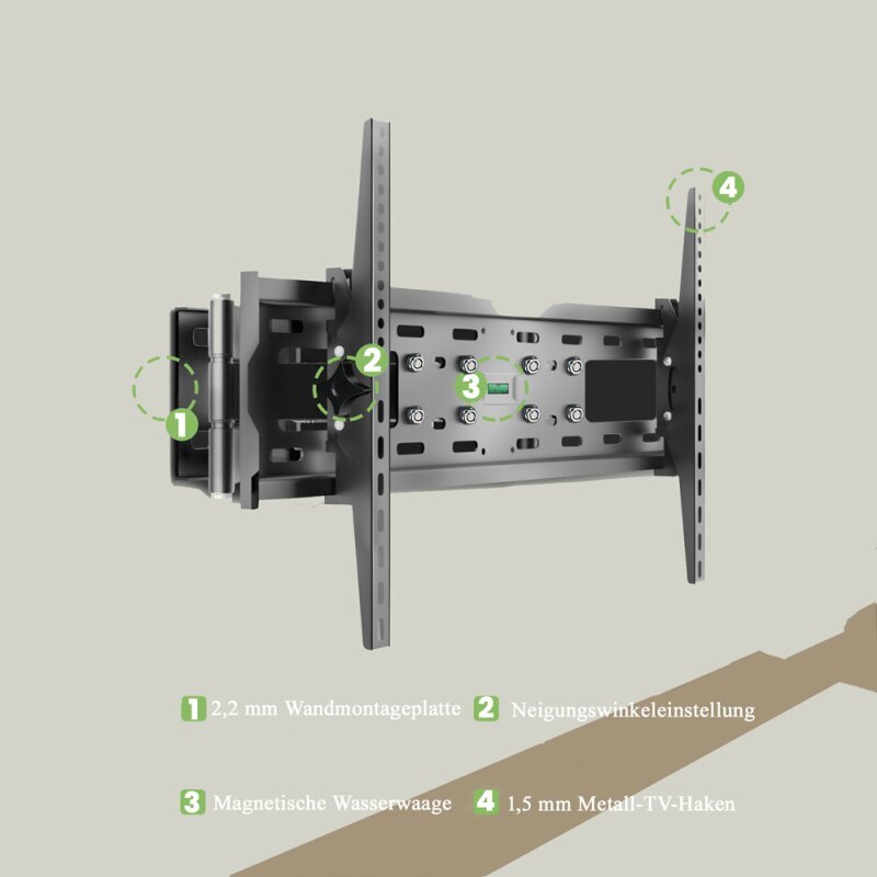 Egal, ob Sie einen 32-Zoll oder einen großzügigen 70-Zoll Fernseher besitzen, unser Wandhalter ist darauf ausgelegt, Bildschirme von 81 cm bis 178 cm sicher zu halten, mit einem maximalen VESA-Standard von 600x400 mm. Mit einer robusten Konstruktion, die bis zu 55 kg tragen kann, können Sie sich darauf verlassen, dass Ihr Fernseher sicher und stabil montiert ist.